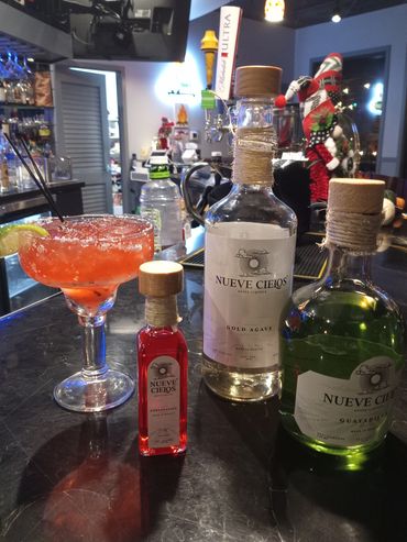 Recipe: 1 part Nueve Cielos Gold Agave, 2 parts Nueeve Cielos Passion Fruit, 1 part Nueve Cielos Pomegranate with fresh squeezed lime served chilled.